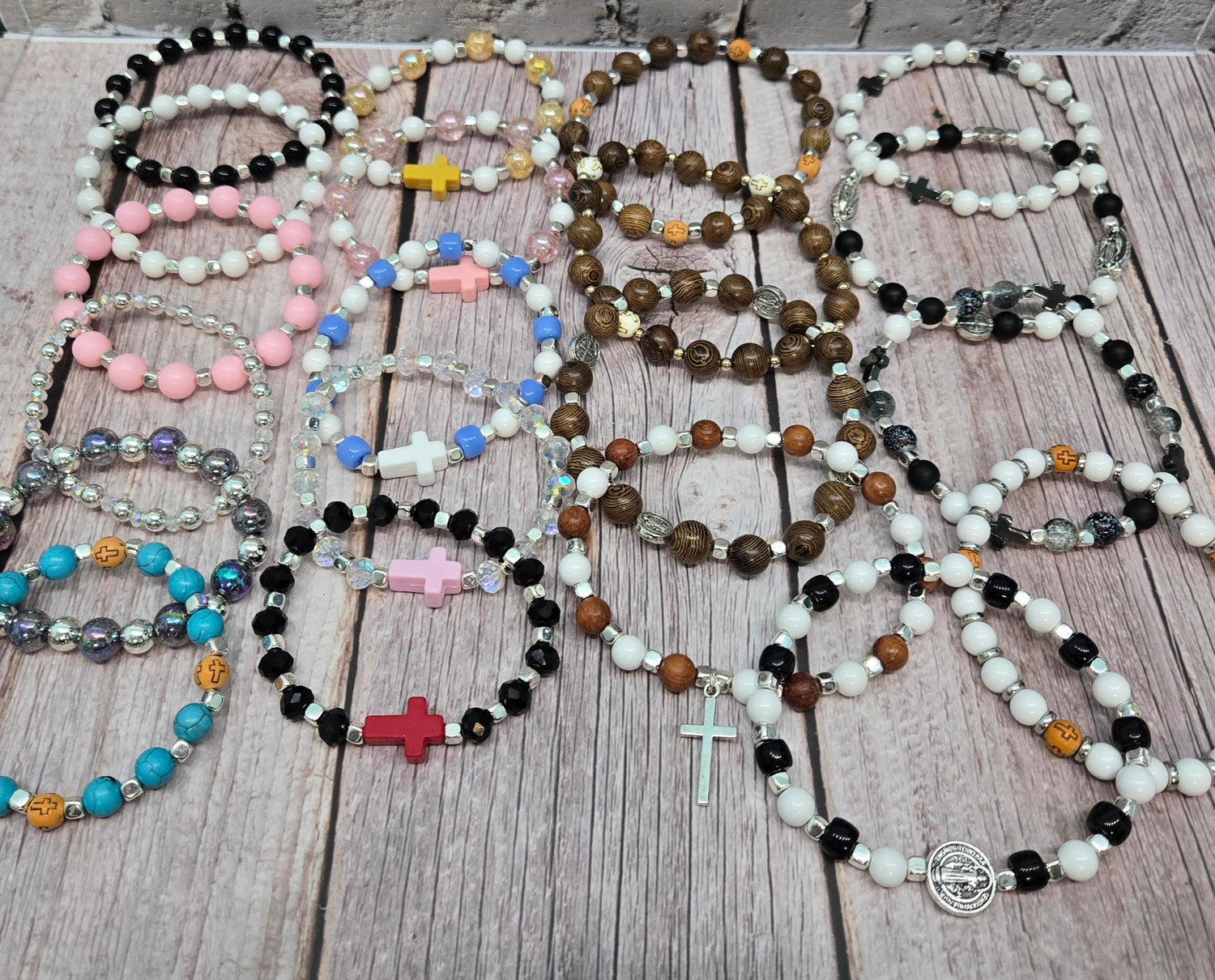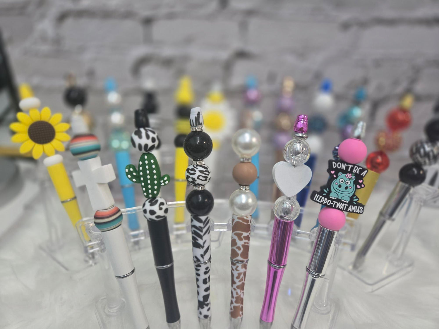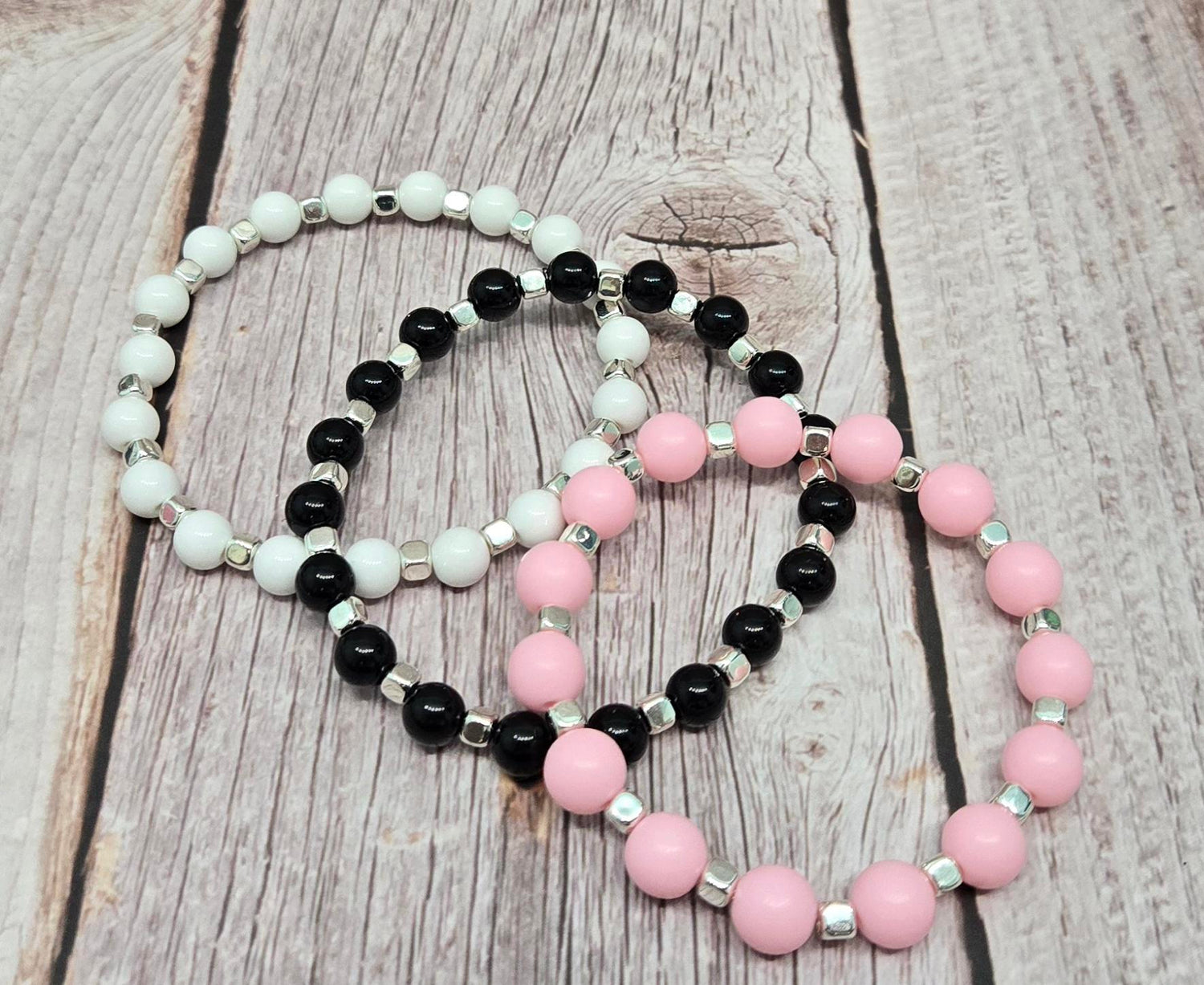 Custom handmade beaded bracelets with pink, black, and white beads.