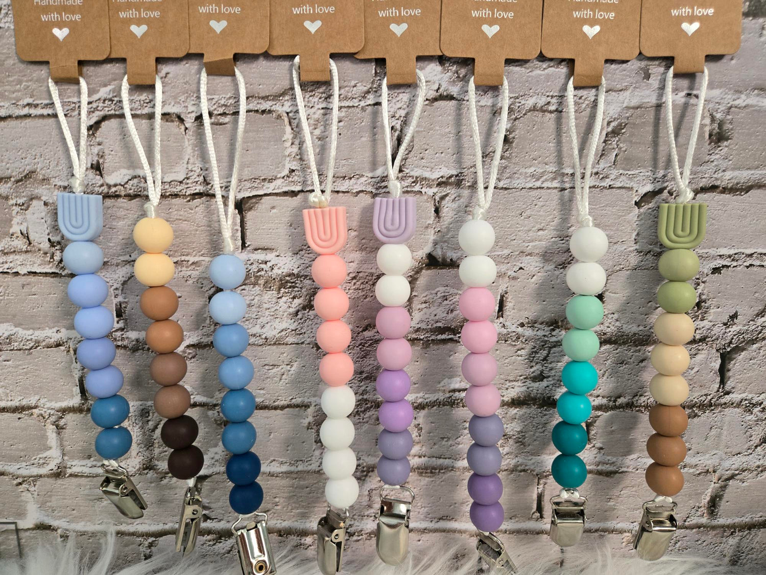 Custom handmade beaded Pacifier Clips make keeping up with babies pacifier easy while coordinating to match you and your babies style.