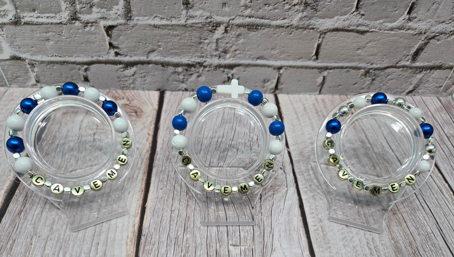 Custom handmade beaded bracelets with blue and white beads and custom lettering.