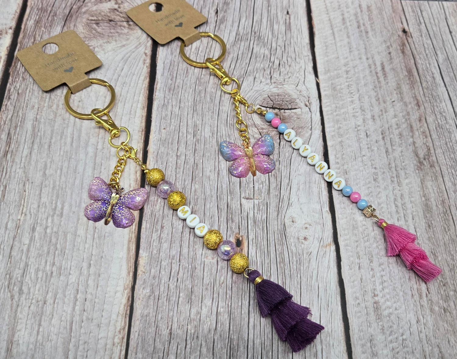 Custom handmade beaded bag charms with butterfly charms and custom lettering.