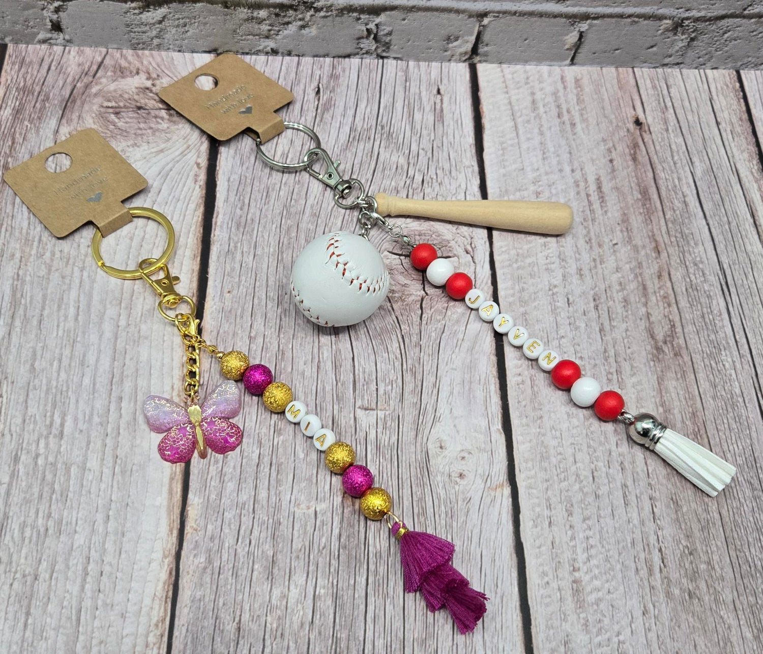 Custom handmade bag charms with butterfly/baseball charms and custom lettering.