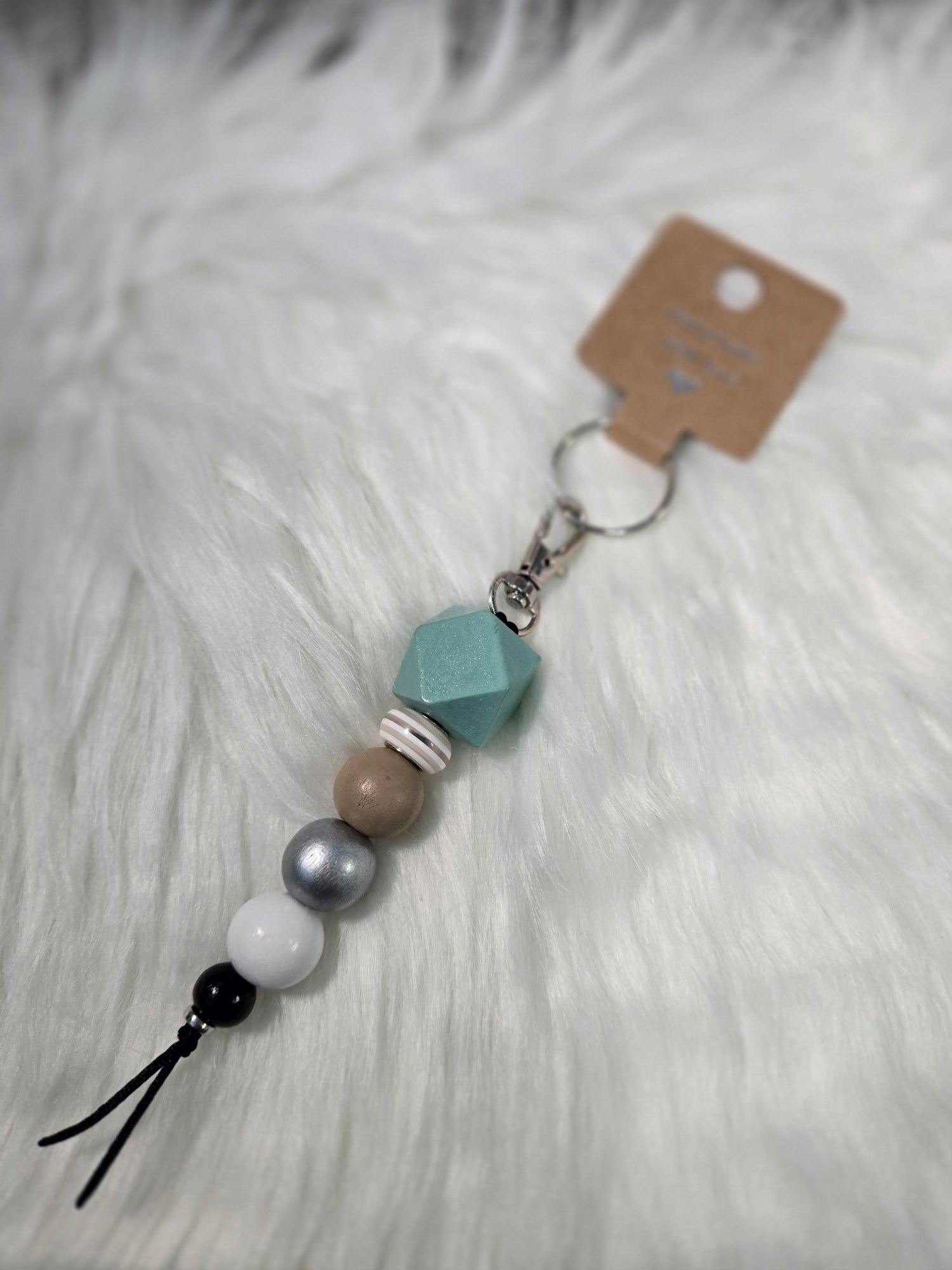 Custom handmade bag charms with fun wooden beads in teal, tan, white, and silver to add style to any bag.