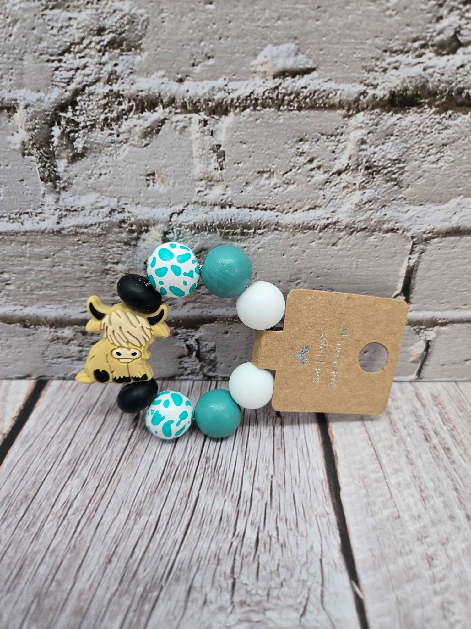 Custom beaded tumbler cup charm with a highland cow themed focal bead. Makes a perfect gift for that special you know that loves highland cows. Attaches to tumbler handle with twisty keyring.