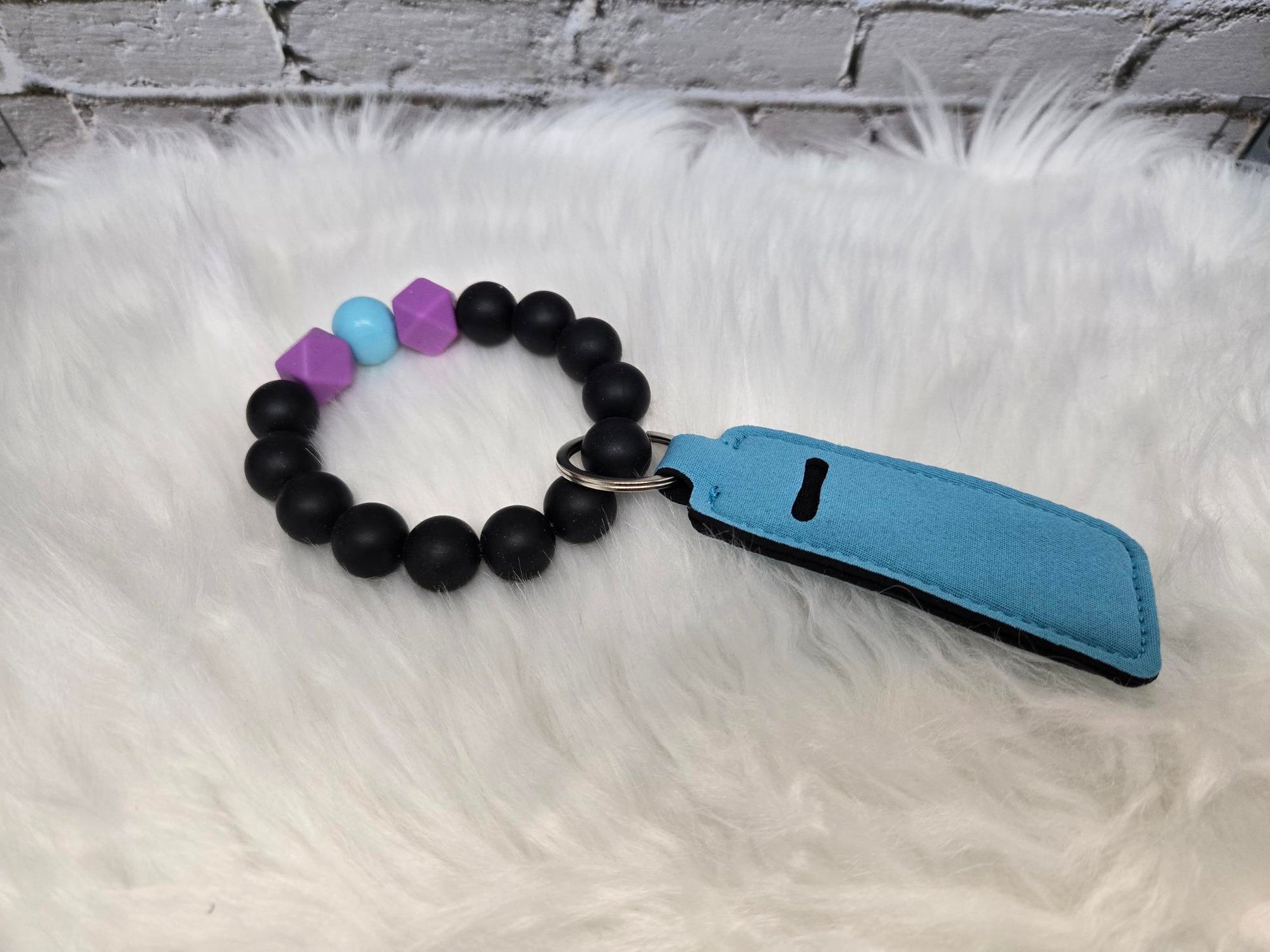 Handmade beaded wristlet with black, purple, and blue beads and a blue ChapStick holder. Perfect for those on the go. Women's standard size.