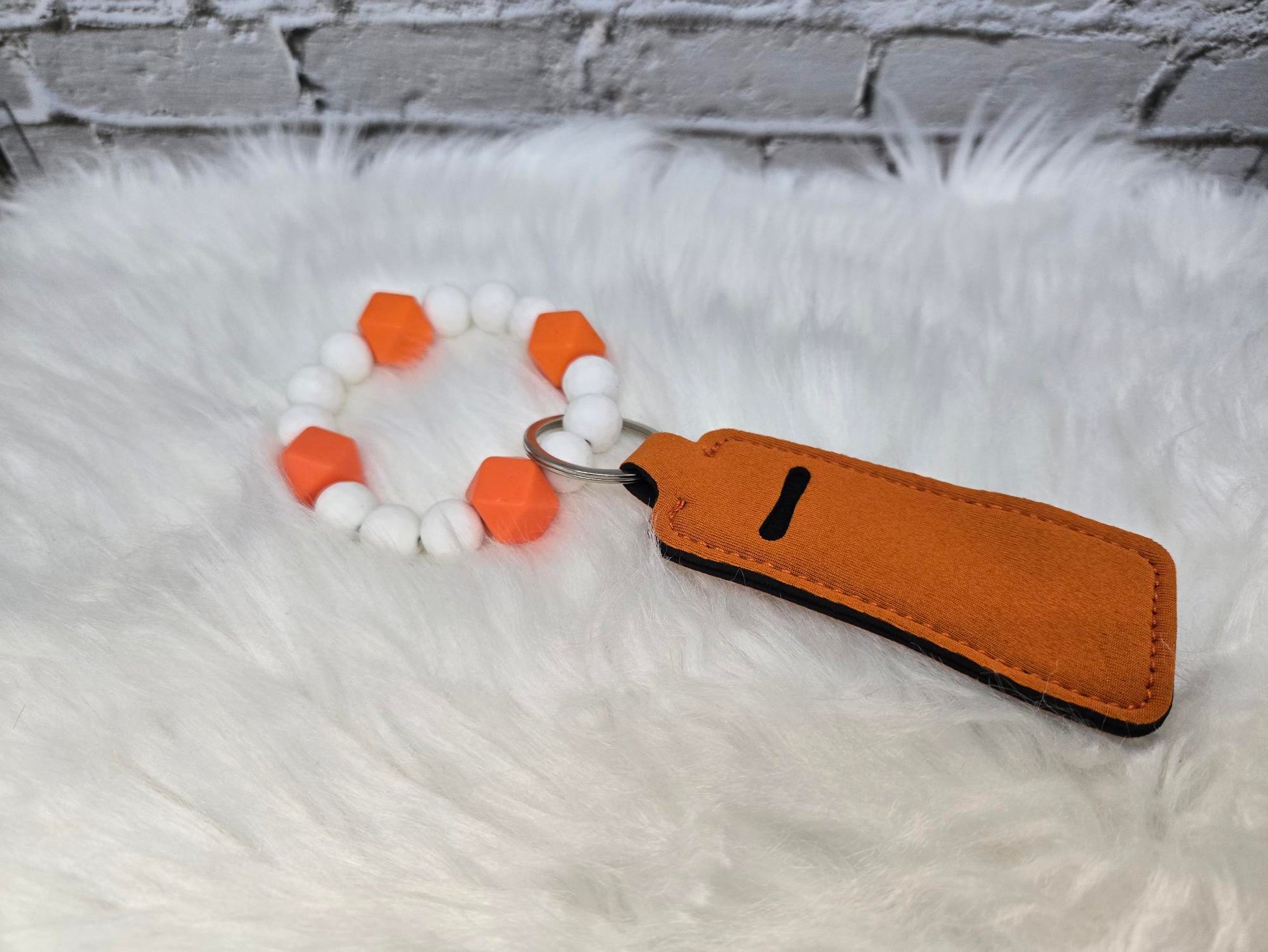 Handmade beaded wristlet with white and orange beads and a orange ChapStick holder. Perfect for those on the go. Women's standard size.