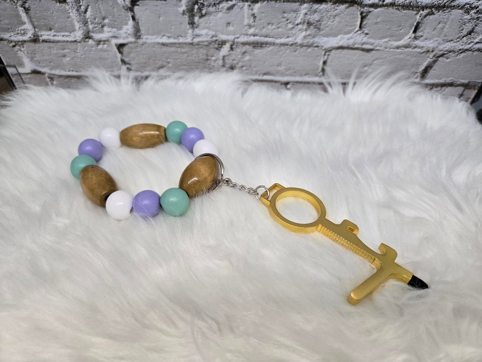 Handmade beaded wristlet with lightweight wooden teal, purple, white, and natural wood beads and a gold door opener tool. Perfect for those on the go. Women's standard size. Door opener tools provide benefits such as enhanced accessibility, improved safety and security, and greater convenience.