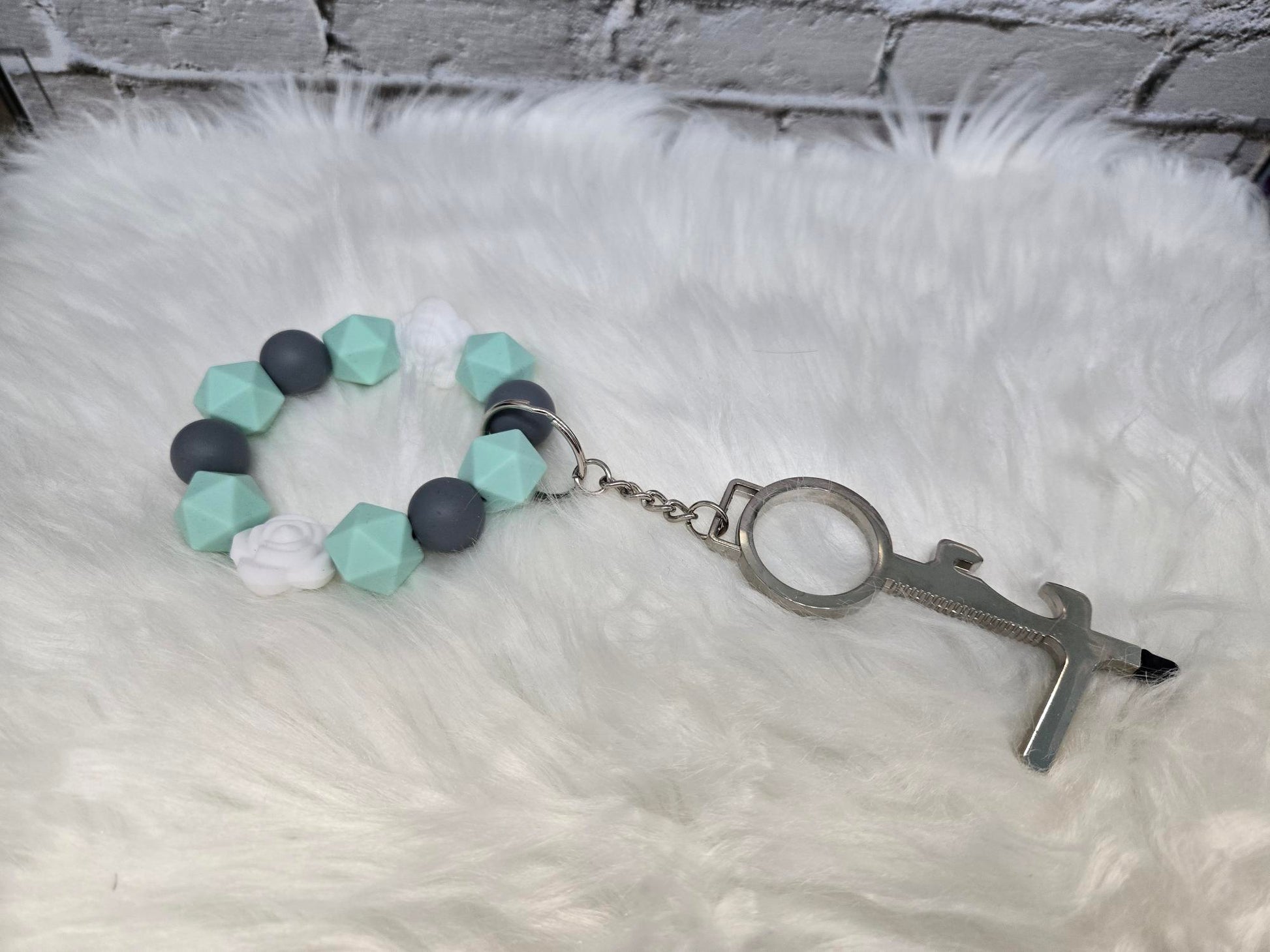 Handmade beaded wristlet with gray, teal, and white beads and a silver door opener tool. Perfect for those on the go. Women's standard size. Door opener tools provide benefits such as enhanced accessibility, improved safety and security, and greater convenience.