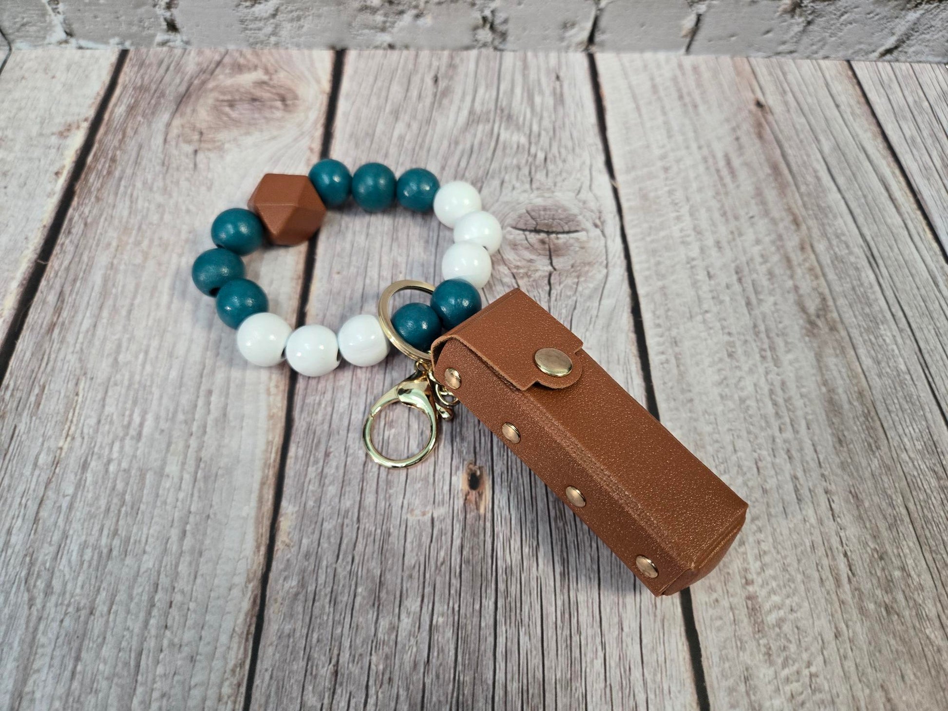 Handmade beaded wristlet with lightweight wooded white and pine green beads with a brown lipstick holder. Perfect for those on the go. Women's standard size.