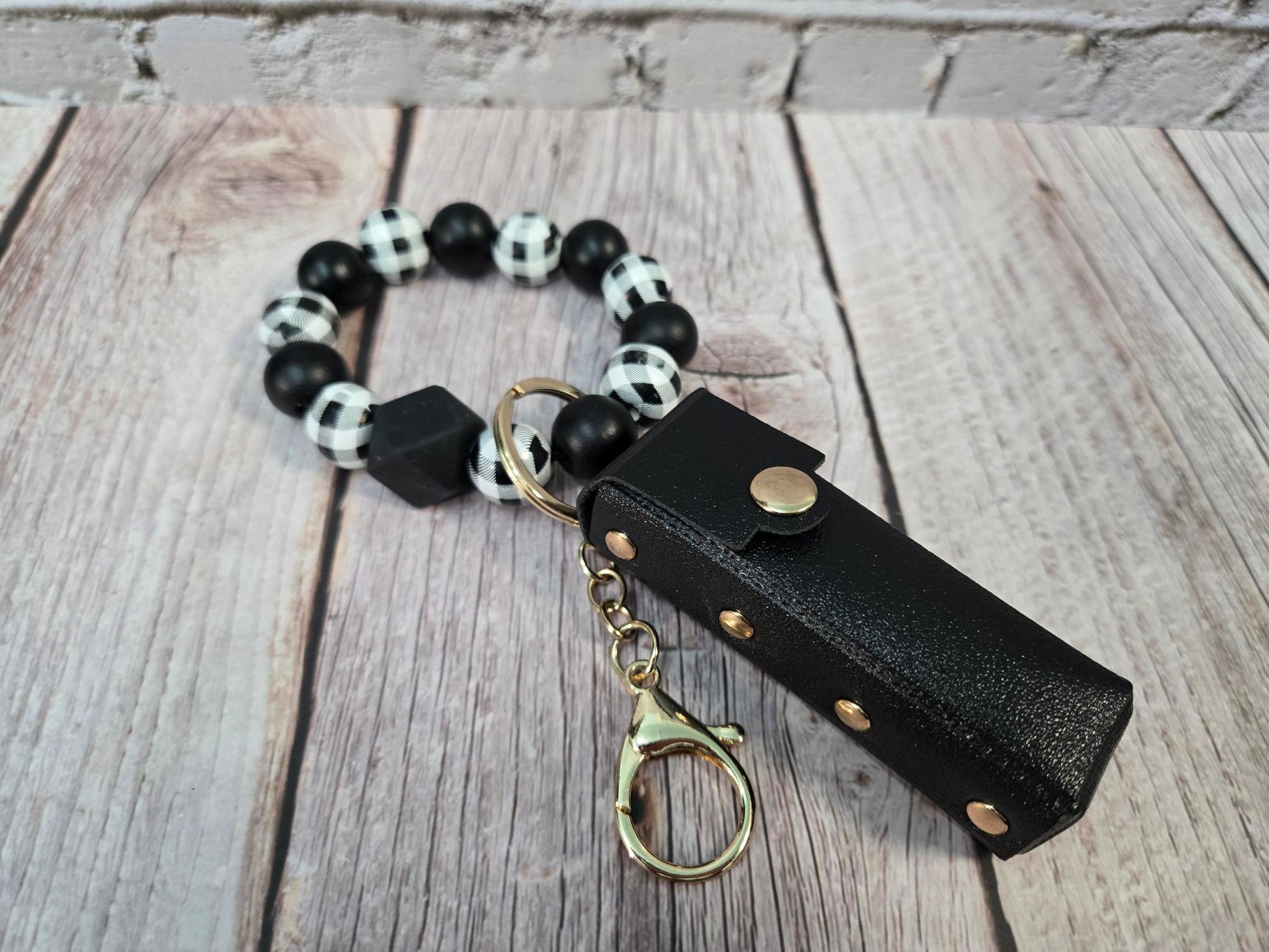 Handmade beaded wristlet with lightweight wooded black and white plaid and black beads with a black lipstick holder. Perfect for those on the go. Women's standard size.