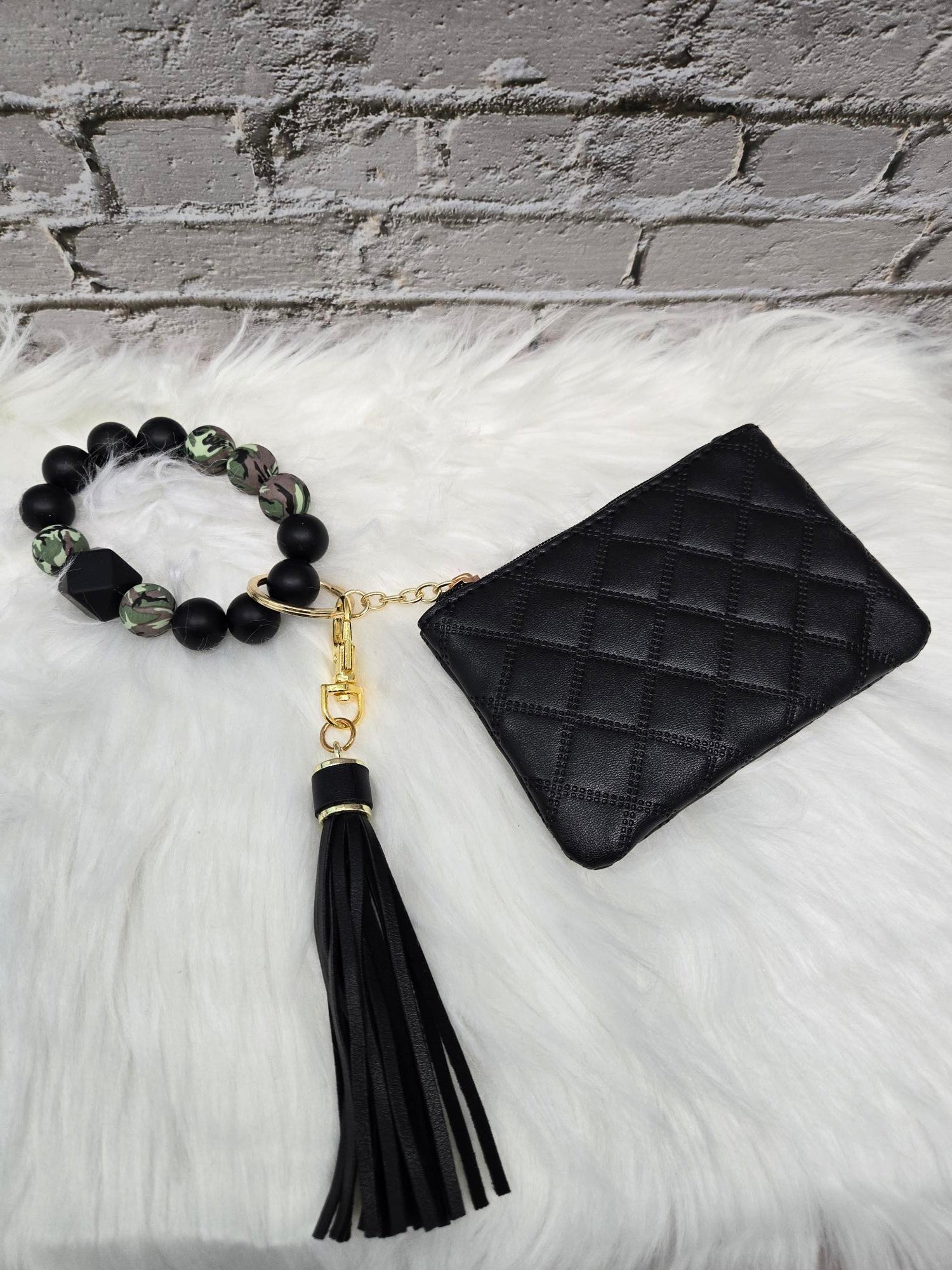 Handmade beaded wristlet with a black wallet, camo and black silicone beads, and black tassel. Made with easy to clean silicone beads. Perfect for those on the go. Women's standard size.